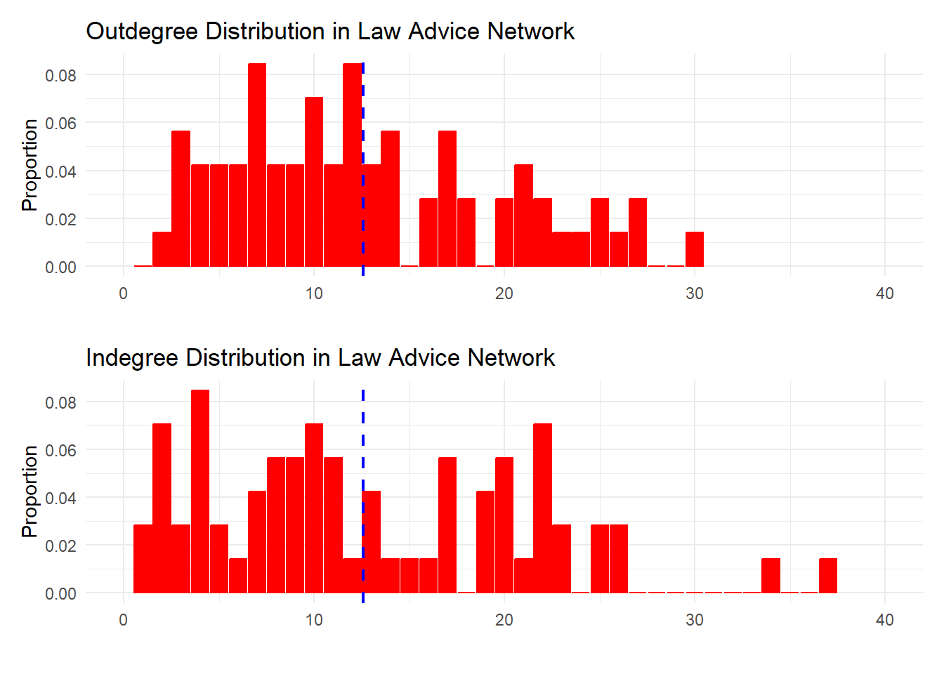 Note also that since the mean degree is the same regardless of whether we use the out or indegree distribution, then the blue line pointing to the mean degree falls in the same spot on the x-axis for both plots.