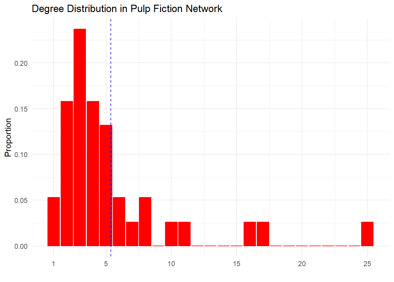 The plot clearly shows that the Pulp Fiction network degree distribution is skewed with a small number of characters having a large degree \(k \geq 15\) while most other characters in the movie have a small degree \(k \leq 5\) indicating inequality of connectivity in the system.