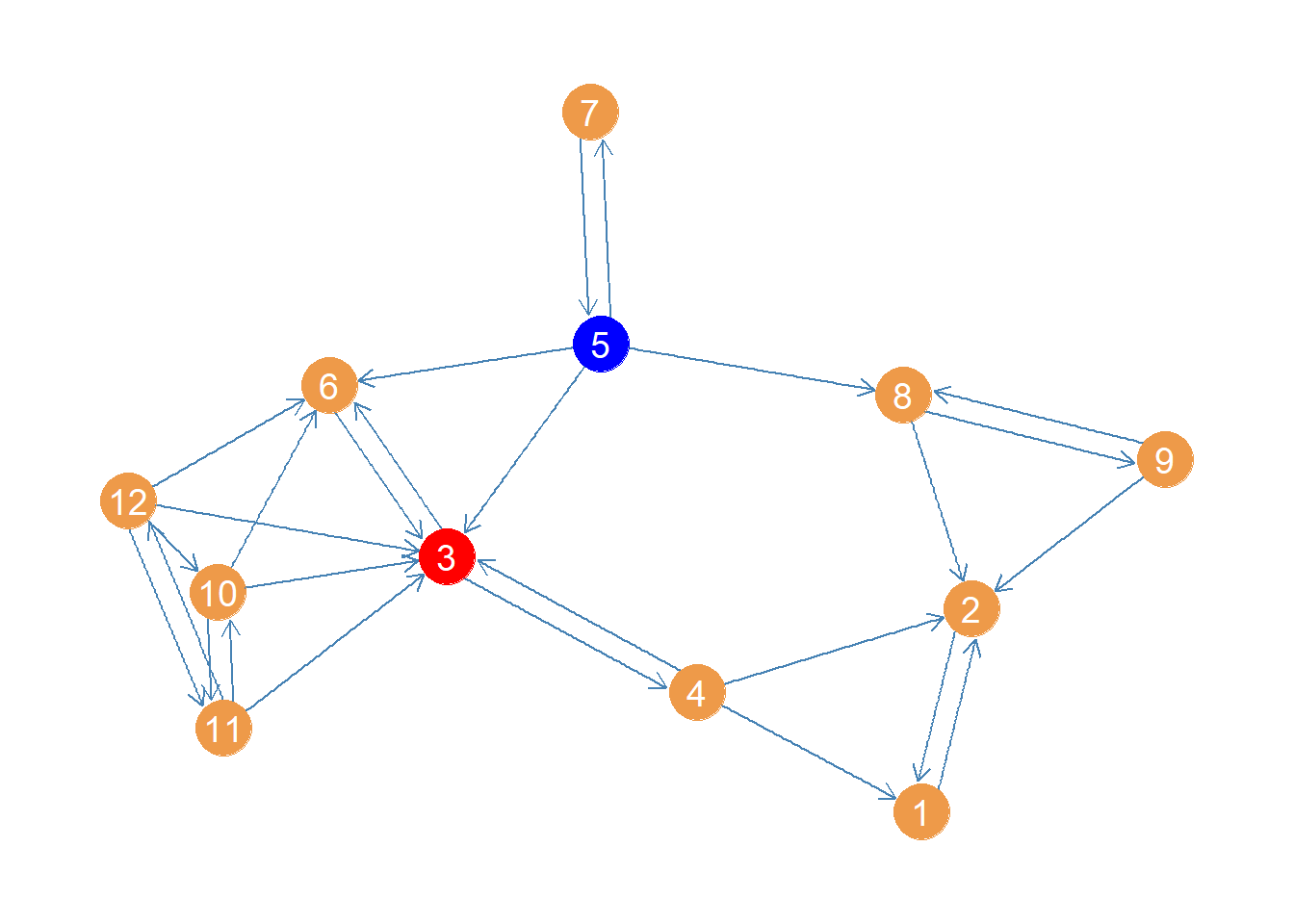 In contrast to closeness, there is no problem computing betweenness in the directed case. The reason is that if the graph is not strongly connected, and therefore there exists a pair of nodes \(i\) and \(j\) with no directed path from \(i\) to \(j\) (e.g., \(g_{ij}=\infty\)), then we just set \(\sigma_{ij} = 0\) in Equation 3.