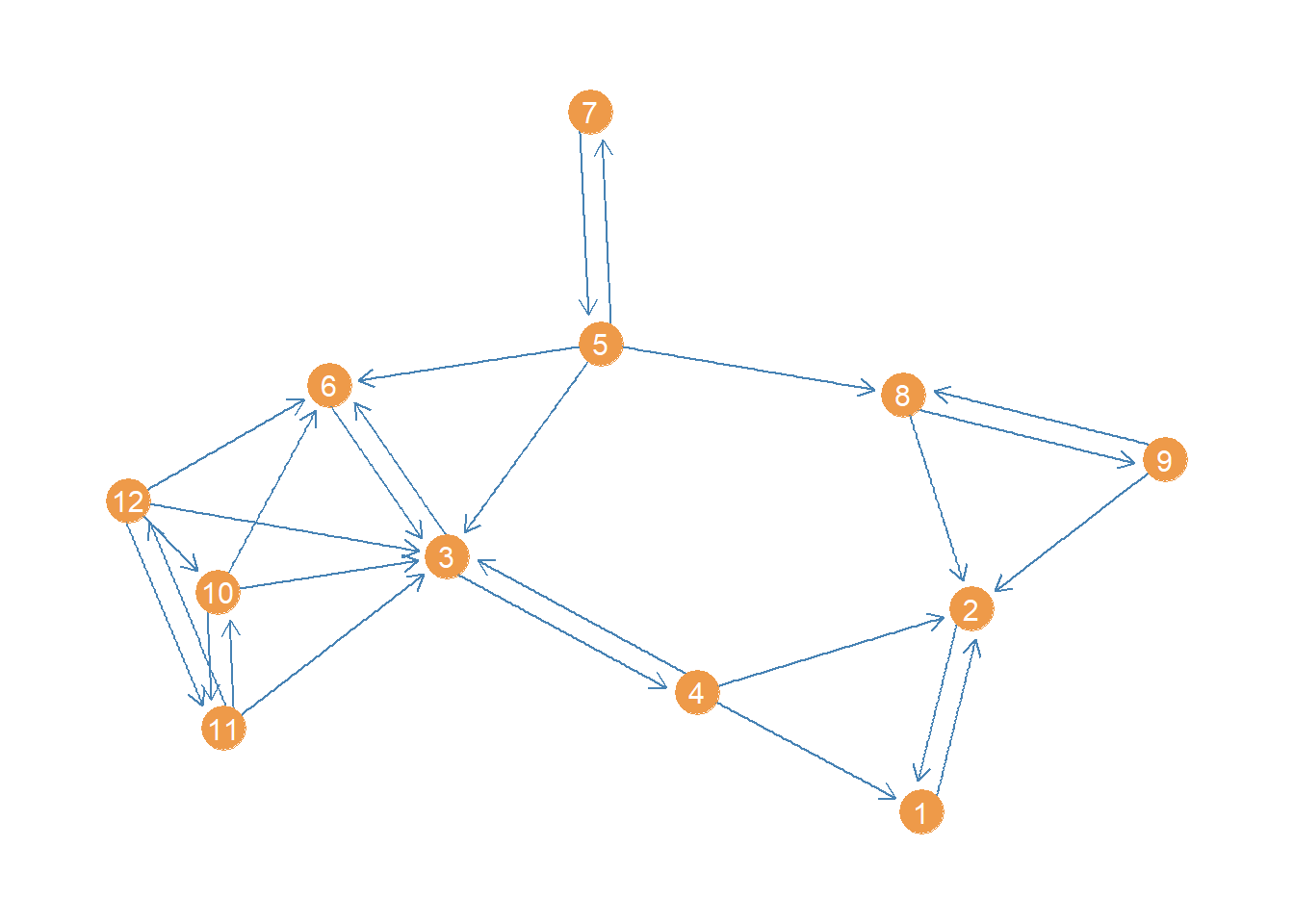 This is better but introduces a problem. The directed graph is not strongly connected, so it means that some nodes cannot reach other ones via a directed path of any length. That means that the geodesic distances from a node to an unreachable node is coded as “infinite” (Inf). The problem with infinity is that it gets in the way of calculating sums of distances, a requirement for the closeness centrality.