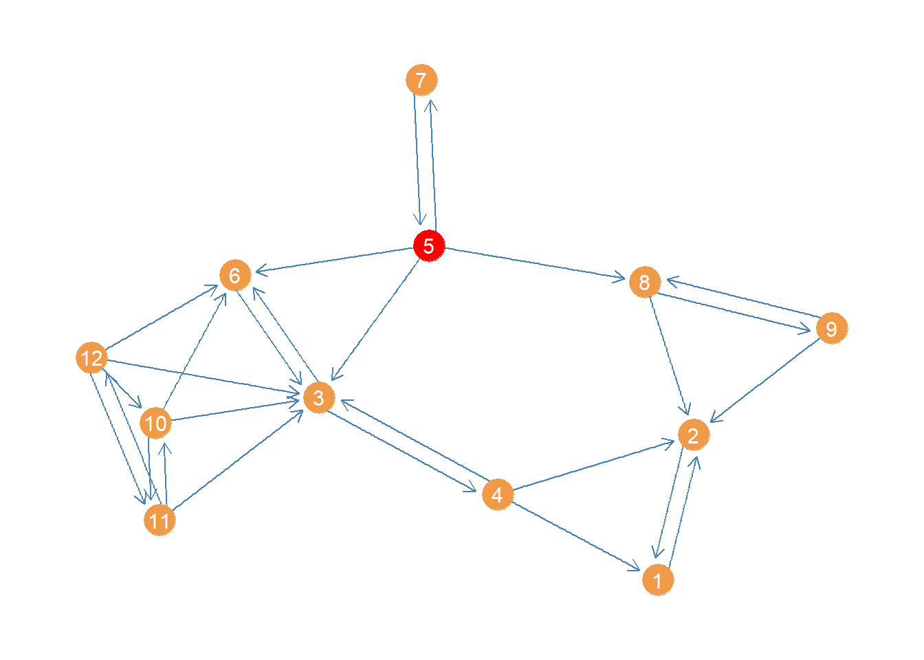 We can see that the highest harmonic closeness centrality node is 5, followed by 12. Here’s a plot of the network highlighting the highest harmonic centrality node.