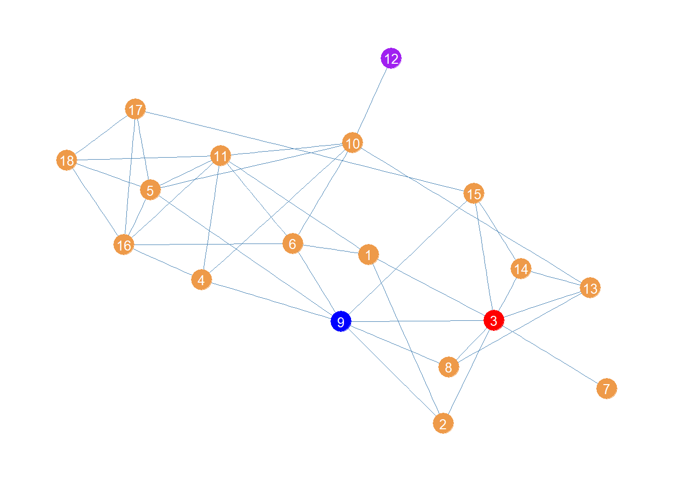 Then in blue we have node 9 who can reach the most others via the shortest paths, and thus comes out on top when the generalized harmonic centrality emphasizes indirect connectivity.