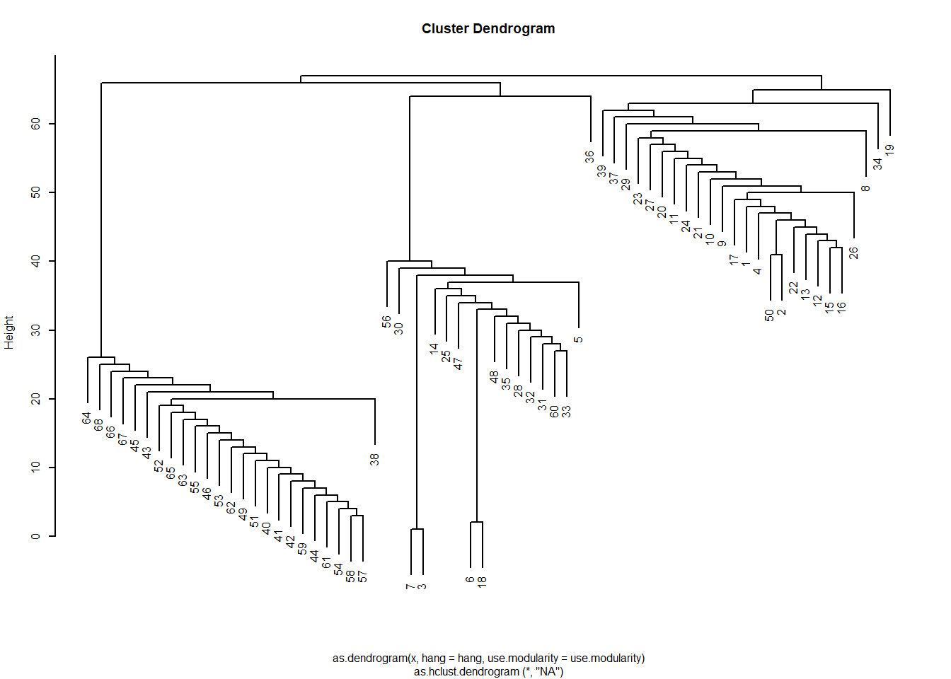 Which gives us the sense that the network is divided into three communities like we saw earlier. If wanted to see which nodes are in which, we could just cut the dendrogram at \(k = 3\):