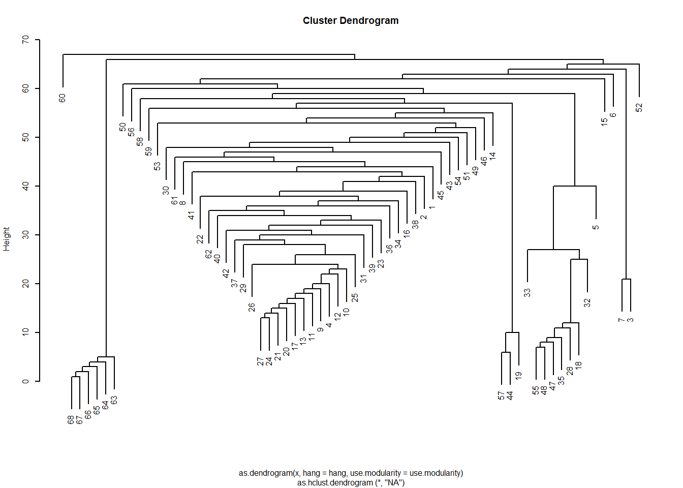 The resulting list object has various sub-objects as components. One of them is called merges which gives a history of the various merges that resulted in the final communities. This means that we can view the results as a dendrogram just like we did with structural similarity analyses based on hierarchical clustering of a distance matrix.
