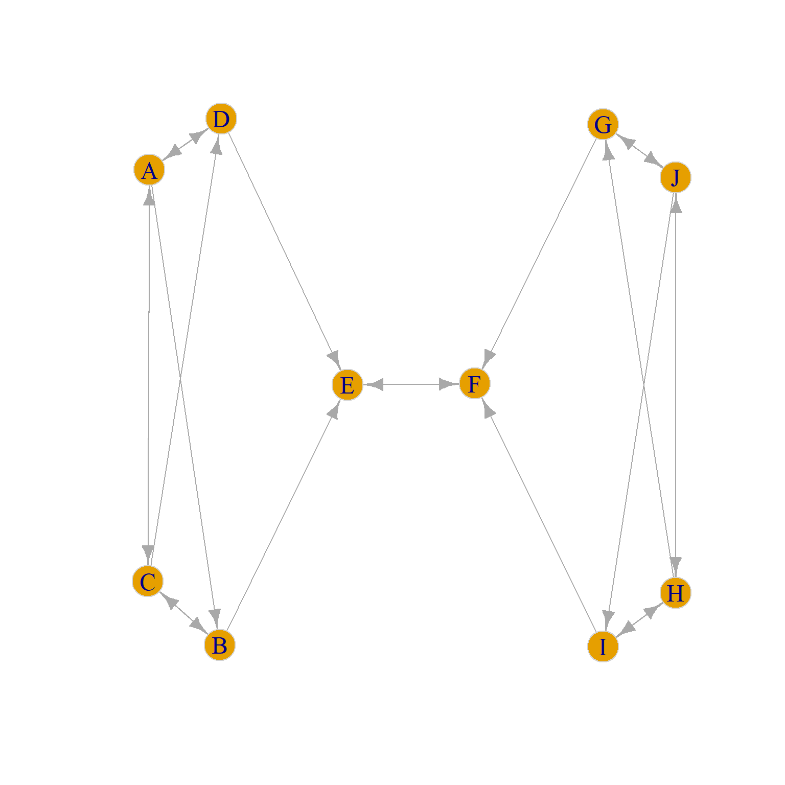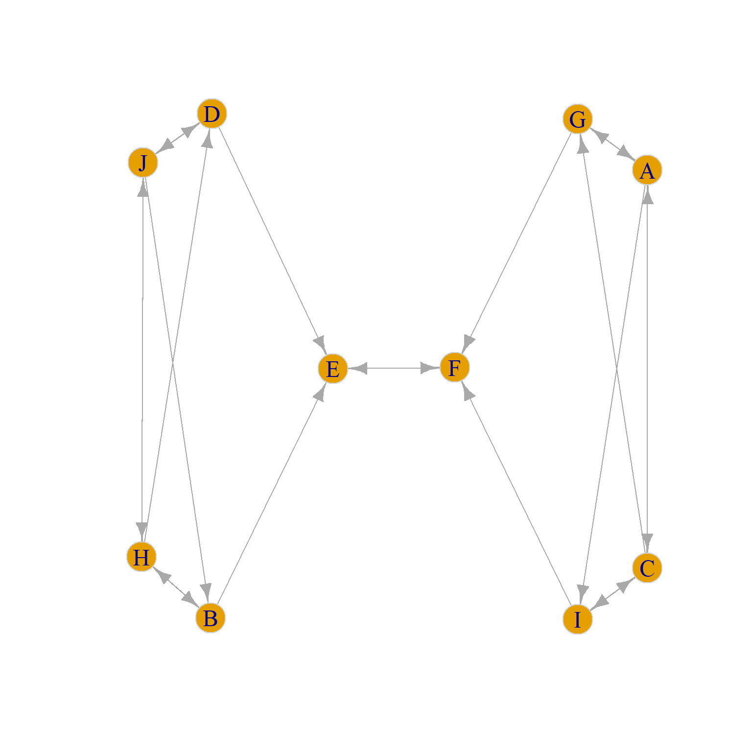 We specify \(\beta = 0.5\) so that SimRank gives equal weight to in and out-neighbors. However, we can see in Figure 4, that Zhao et al’s (2009) generalized version of SimRank does not discover the more general role classes in the Borgatti-Everett graph. It does correctly assign {E, F} to its own group, but then it creates two larger similarity clusters containing nodes {A, B, C, D} and {G, H, I, J} which make sense from the point of view of proximity or cohesion but not from the point of view of role similarity independently of proximity (Borgatti and Everett 1992).