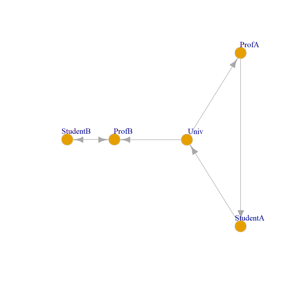 Let us see how it works using the toy example that Jeh and Widom (2002, 540, Figure 2) used in their original paper, shown in Figure 1, which is supposed to be a set of web pages in an university. There is a link from the main University page to that of the two professors, and a link from the professor to the student pages. In addition, “Student B” has a link on their webpage to the corresponding professor, and “Student A” has a link on their webpage to the main university page.