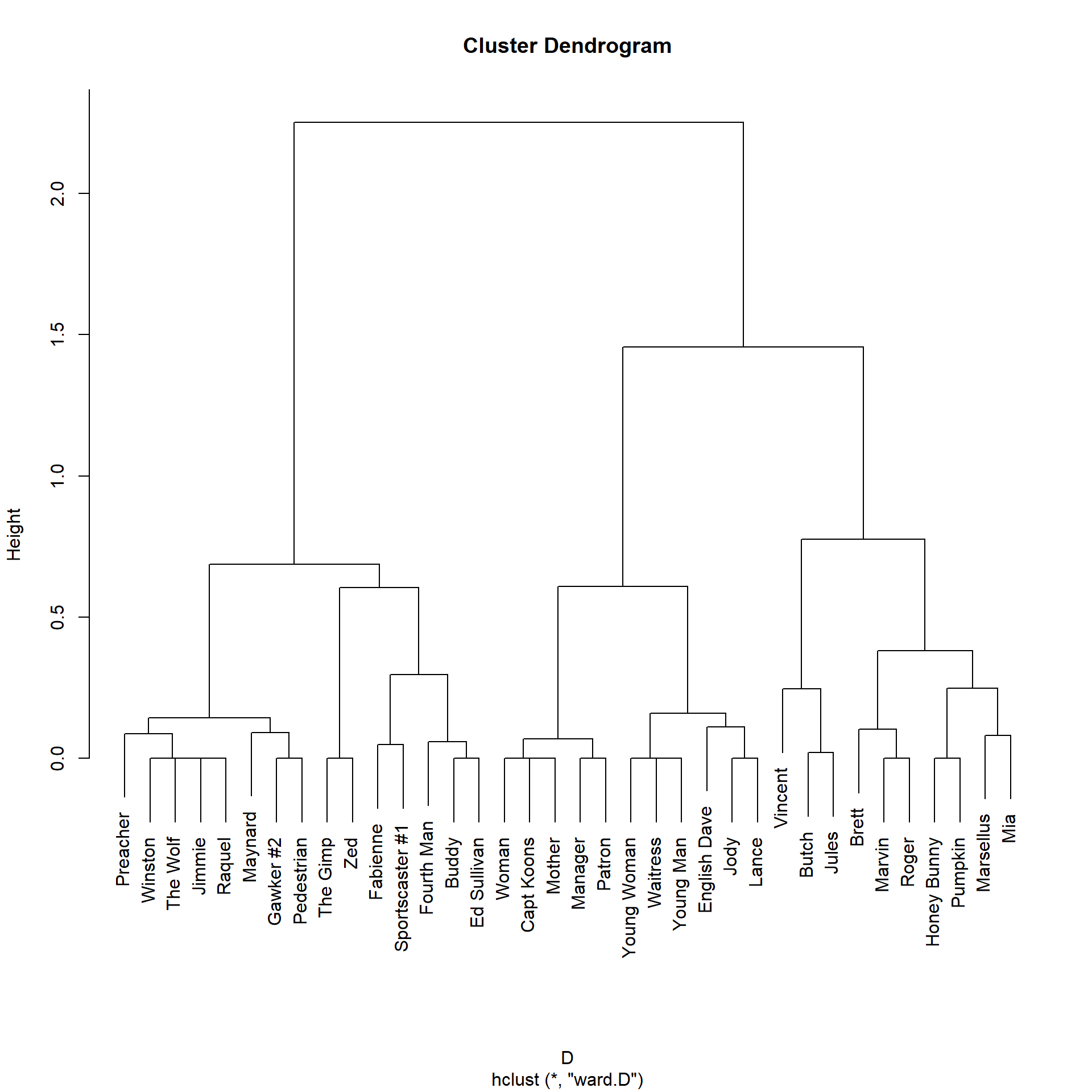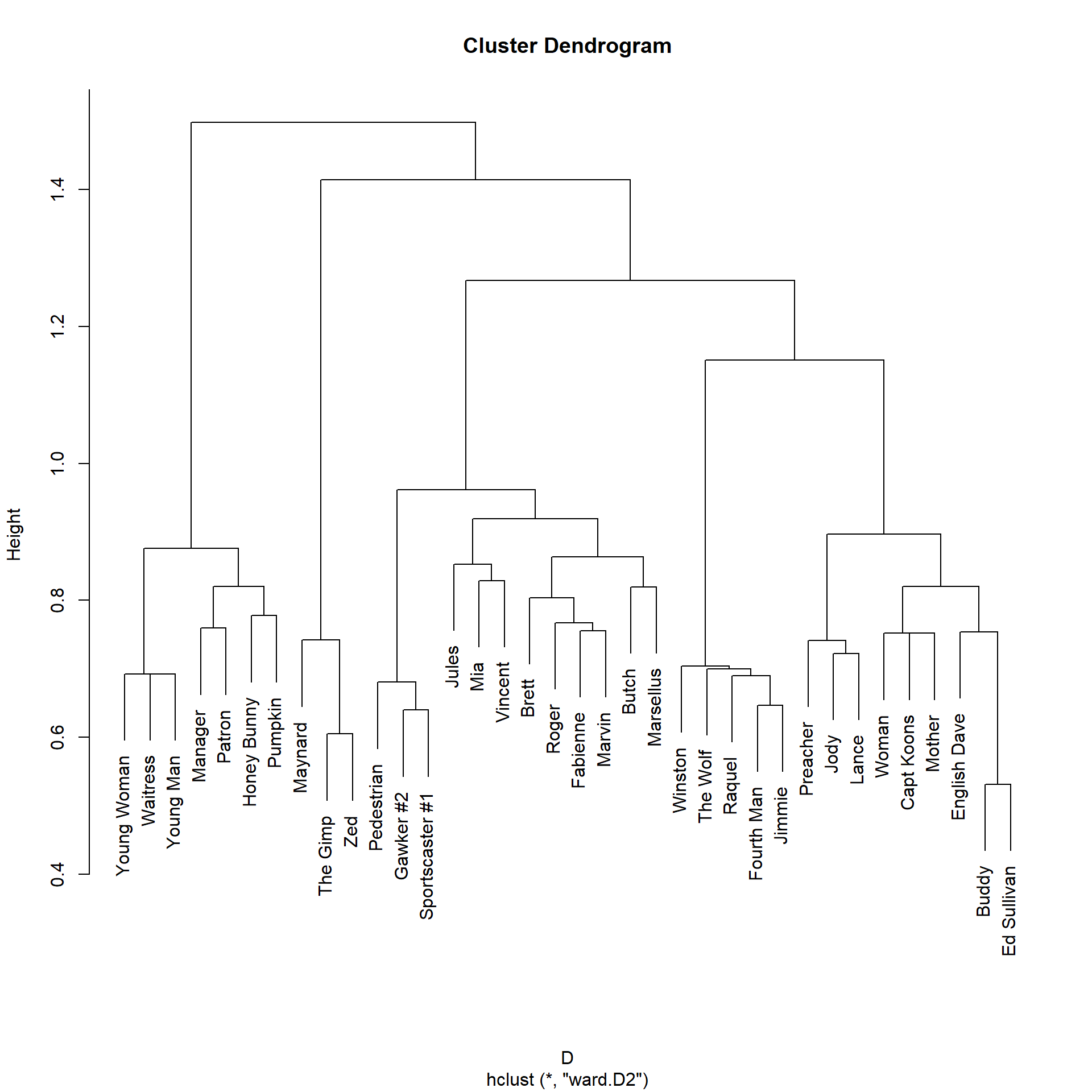 The plot suggests a division into five major node clusters. On the left we have the people in the diner scene (e.g., Pumpking and Honey Bunny), followed by a small cluster of people in the sex dungeon scene (Maynard, The Gimp, and Zed). The we have the main character cluster in the middle (Jules, Mia, Vincent, Butch, Marsellus), and then we have characters in the cleanup scene (Jimmie, The Wolf), followed by a cluster of smaller characters.