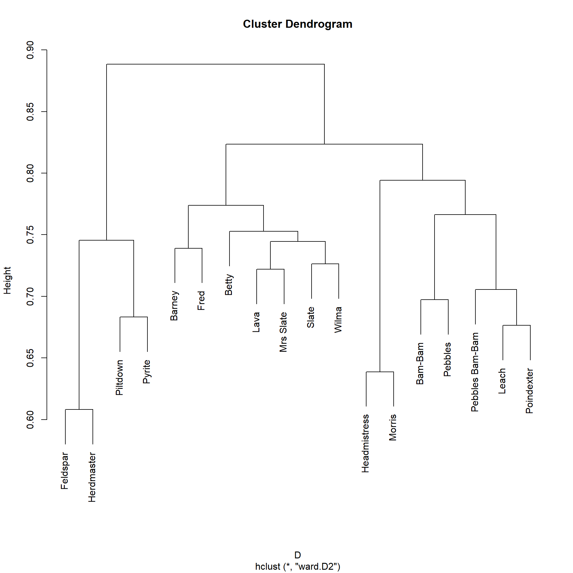 Which returns a somewhat different role partition than the metrics relying on structural equivalence. In the SimRank equivalence partition, \(\{\) Fred, Barney \(\}\) are in their own standalone class, while \(\{\) Betty, Wilma, Slate, Mrs. Slate, Lava \(\}\) appear as a separate cluster.