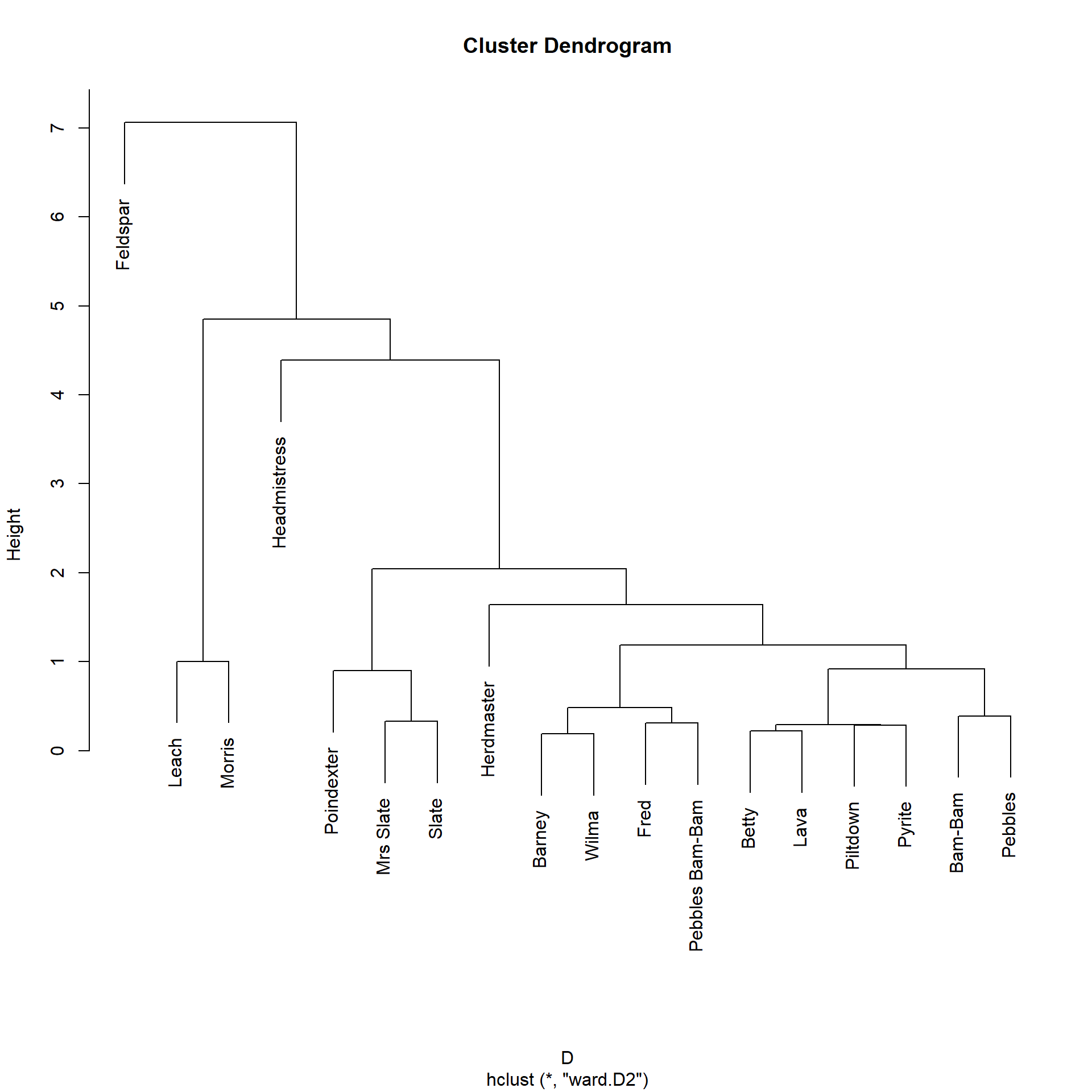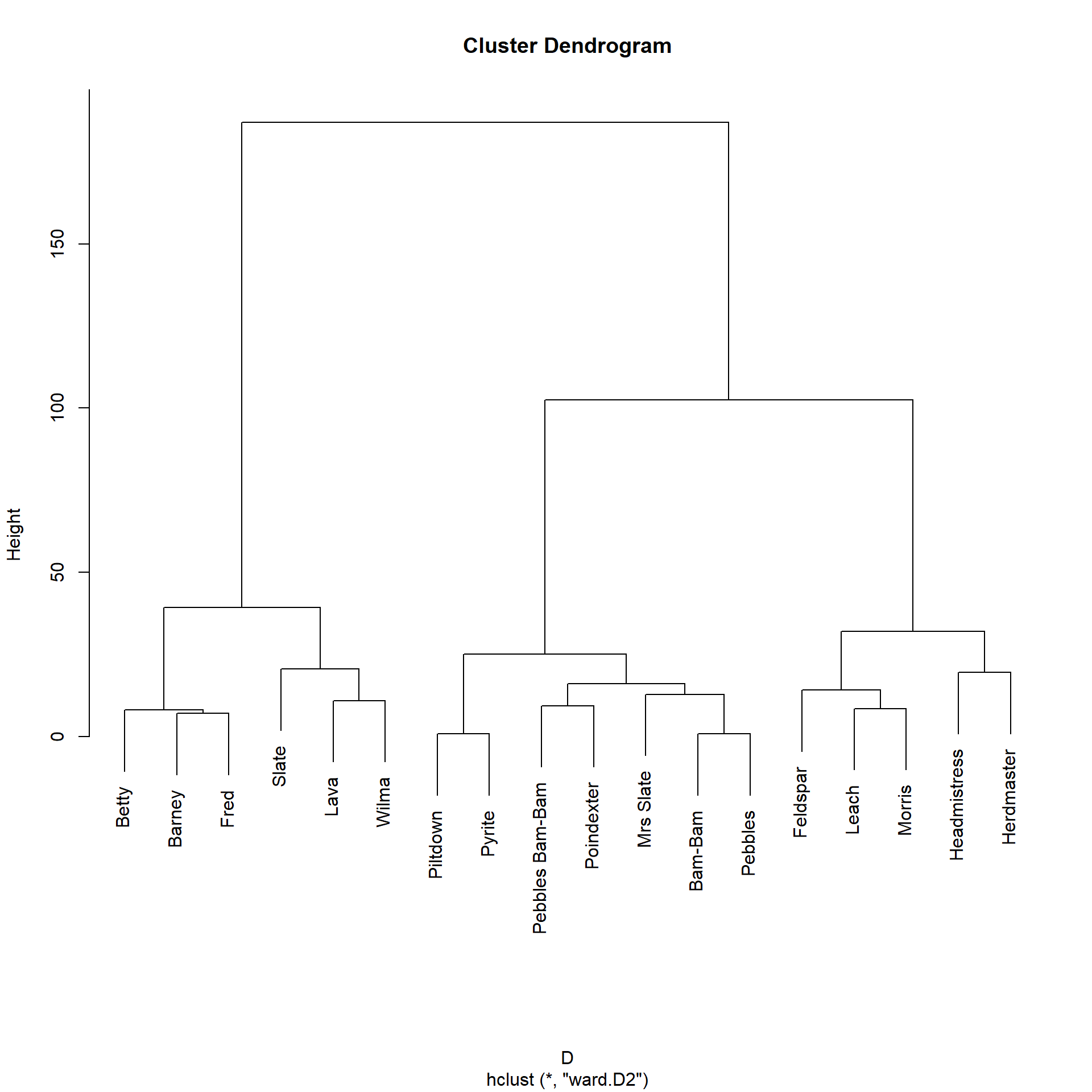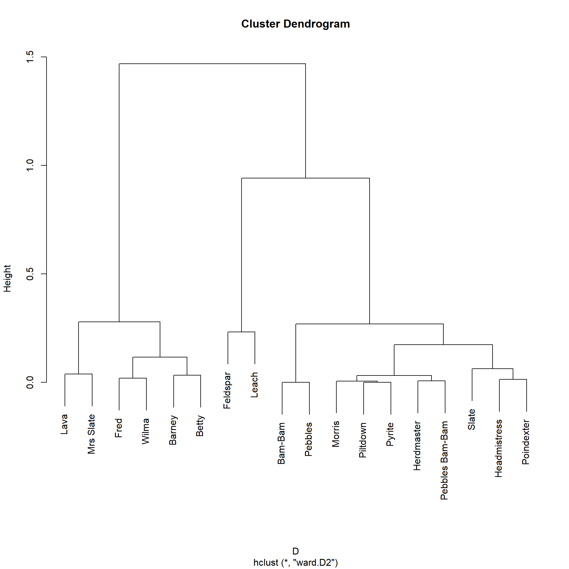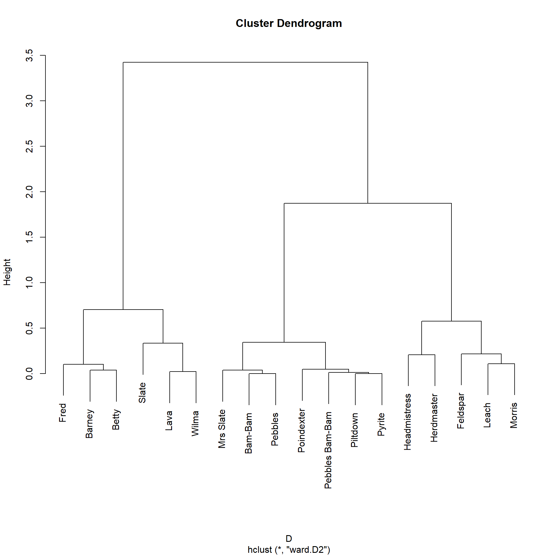 Which looks better. As we would expect, Fred is very similar to Barney and Betty. We can then do the standard hierarchical clustering to see how this similarity measure groups nodes: