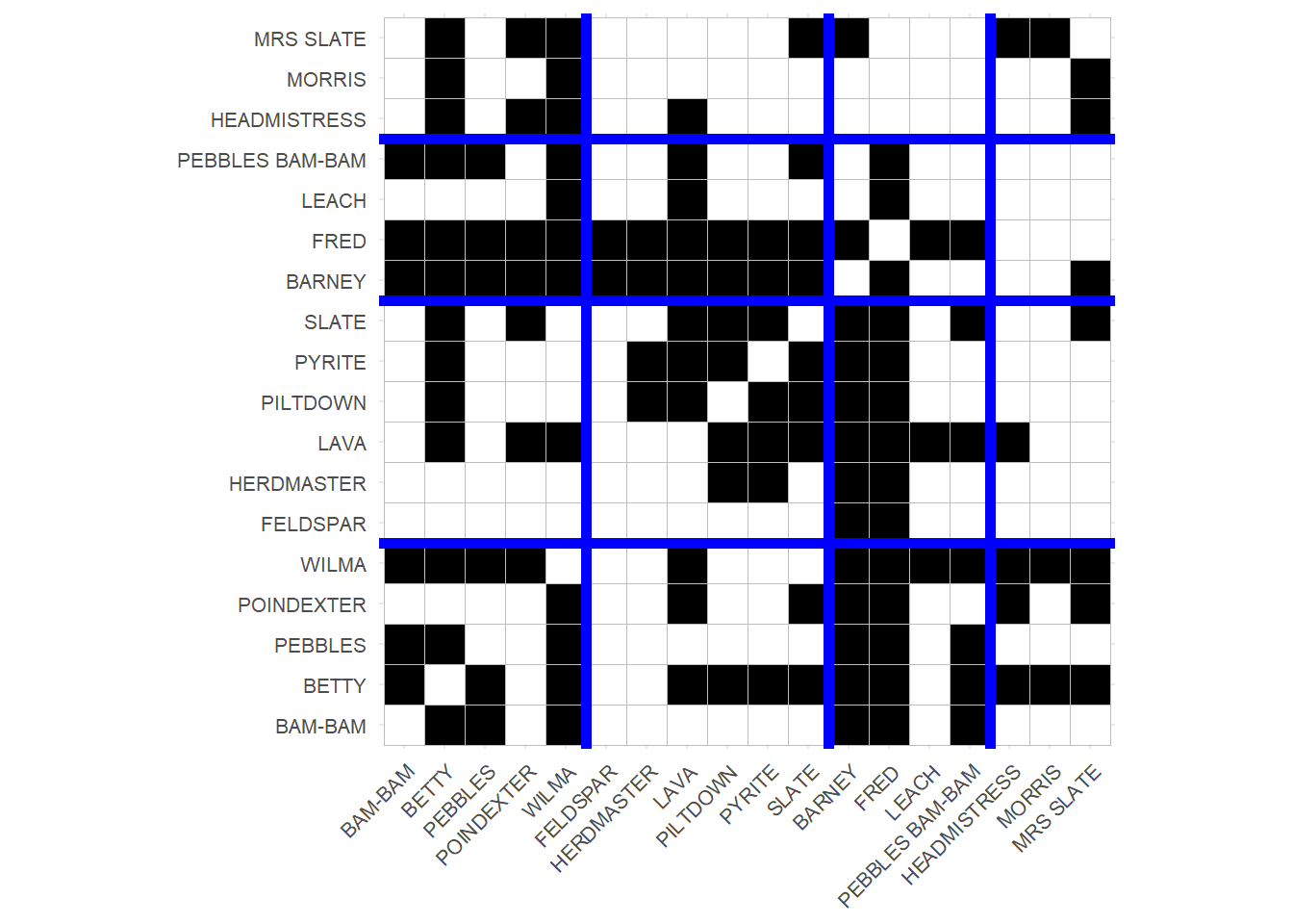This is called a blocked adjacency matrix. As you can see, once the structural equivalence relations in the network are revealed by permuting the rows and columns, the adjacency matrix shows an orderly pattern.