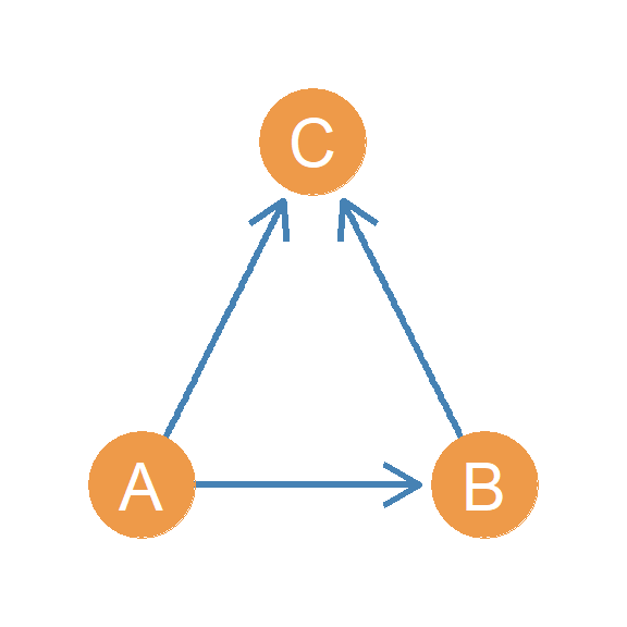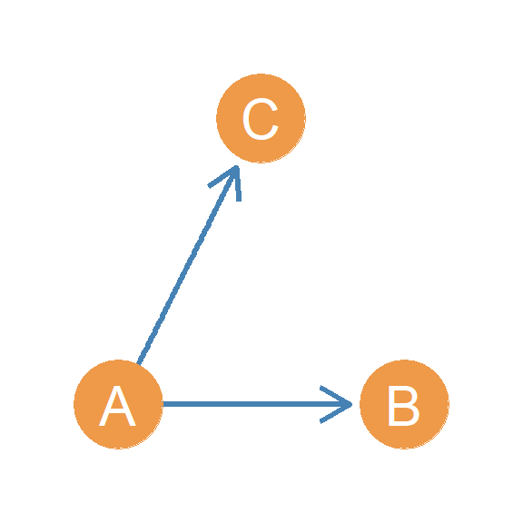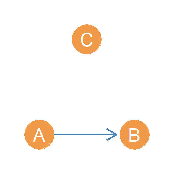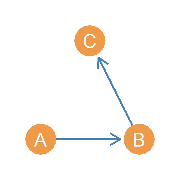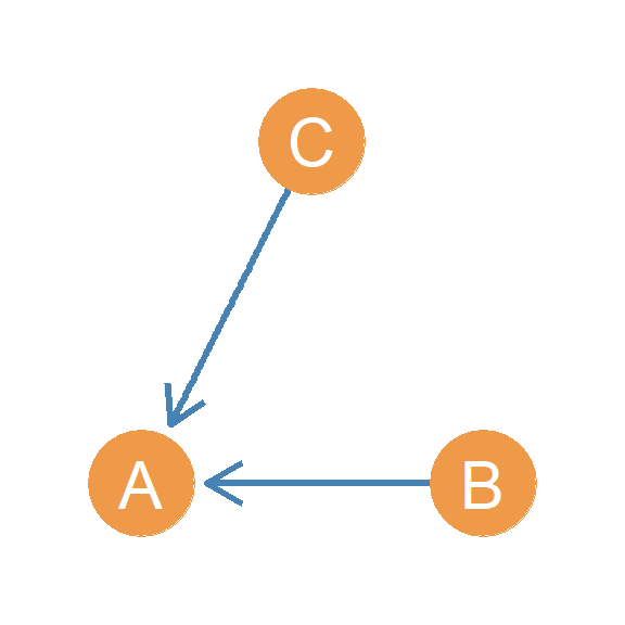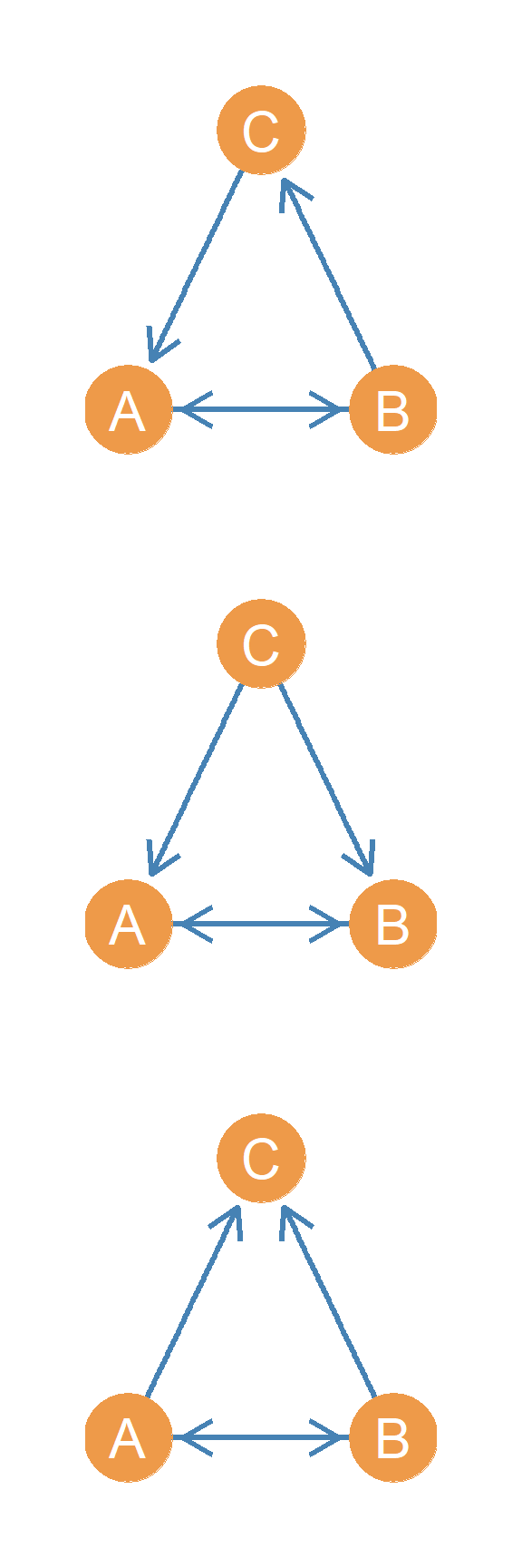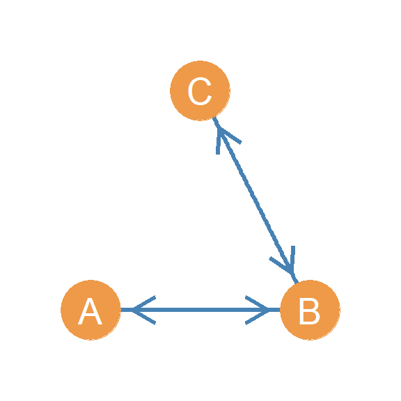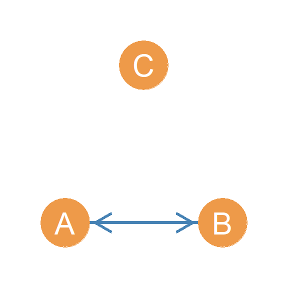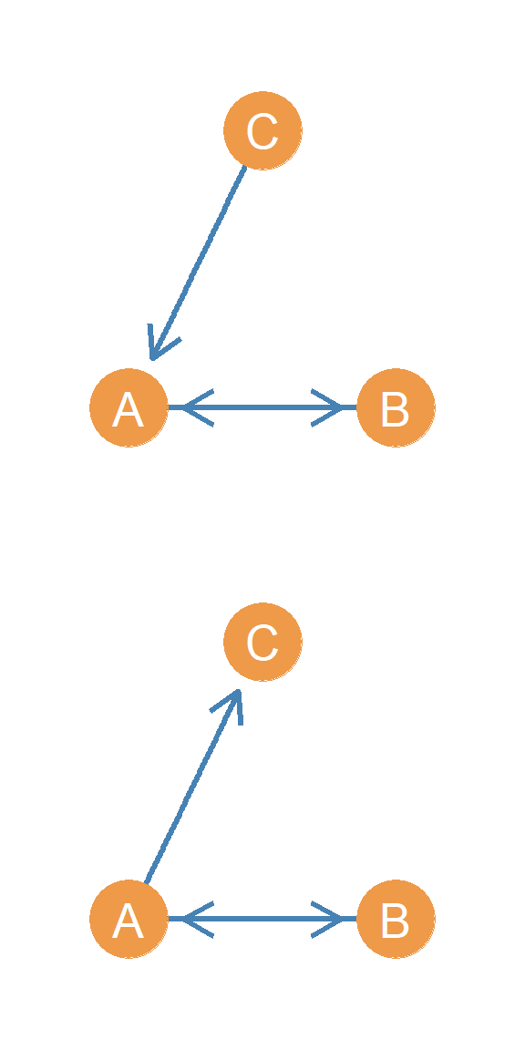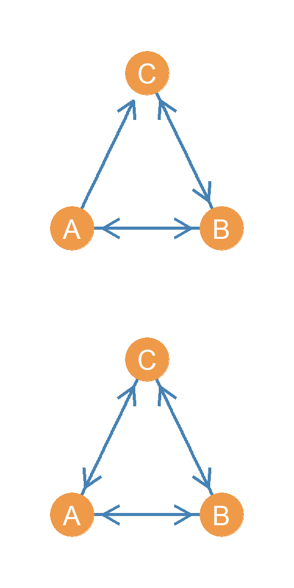 In another setup, we have a person who directs two asymmetric edges to two other people, who are themselves connected by an asymmetric edge. Let’s call this triad \(AAA(I/O)\). Why this weird name? Well if you look at Figure 20.14, this triad combines both the in and out start configurations! In the Figure, node A is the out-star and node C is the in-star. Hence \(AAA(I/O)\), where “I/O” stands for “in/out.”