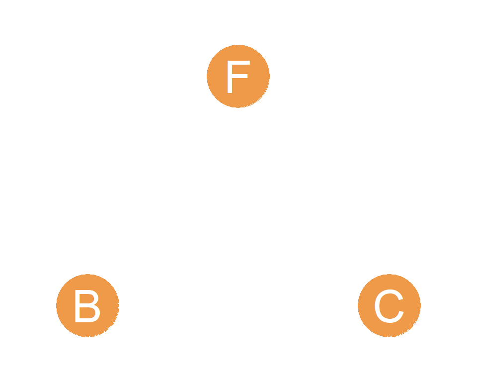 Take for instance, the subgraph defined by nodes B, C, and F in the graph shown in Figure 6.1. This is shown in Figure 20.1. It shows three people who are not connected to one another! Like strangers in a park sitting on three different benches. This is called the null triad.