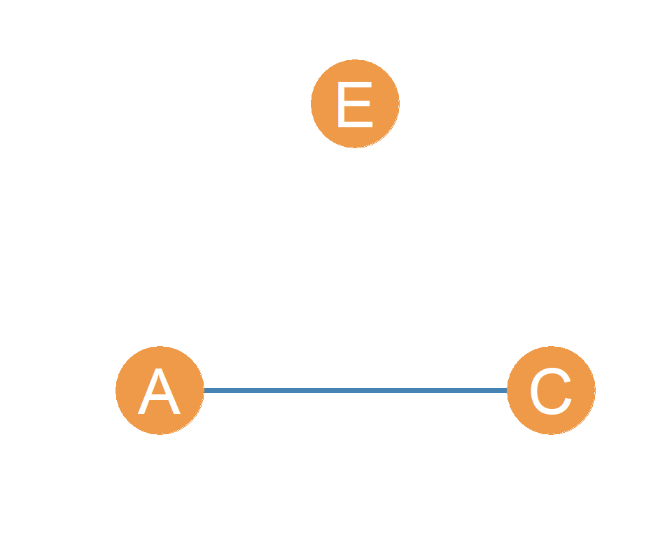 Now let’s define a subgraph using nodes A, C, and E. The resulting triad is shown in Figure 20.2. Now this looks like a pair of friends A and C, in the same room with a stranger (E) whom they are not acquainted with. You may have experienced this before at a social gathering. This is called the disconnected triad. It is disconnected, because the subgraph formed by the three nodes is disconnected, as defined earlier; there is no way that either A or C can reach E, given that E is an isolate in the subgraph.