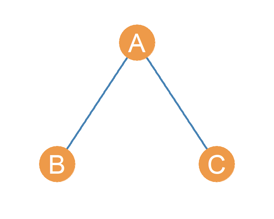We can continue. Let’s define a subgraph from the larger graph in shown in Figure 6.1, but this time we will pick nodes A, B, and C. What comes out? This is shown in Figure 20.3. This time, there is one person, node A, who is acquainted with two other people, nodes B and C, but they don’t seem to know one another. It’s like when you have friends from work and friends from school who have never met. This is called the open triad, because even though the subgraph is connected (there are no isolate nodes like in Figure 20.2, there is a “open hole” in the triad separating nodes B and C. Perhaps A should introduce their friends to one another!