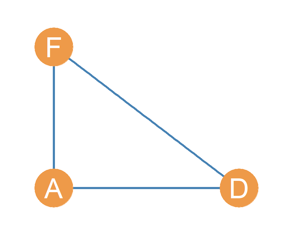 One last one. Let’s define a subgraph from Figure 6.1, but this time let’s pick nodes A, D, and F. The result is shown in Figure 20.4. Now we have three friends all of whom know one another! So there are three distinct pairs of relations in the triad: AD, AF and DF.
