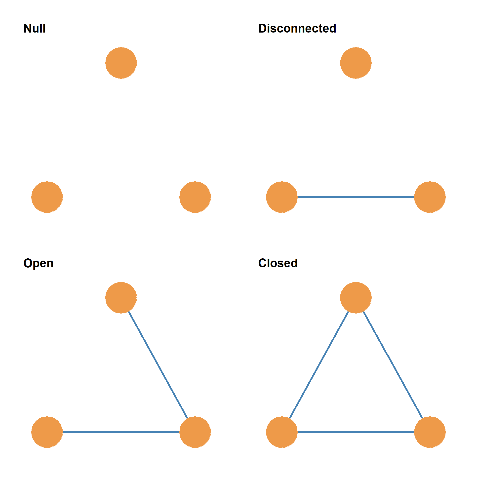 Figure 20.5 shows the four types of undirected triads using unlabeled subgraphs. The key point is that in an undirected graph, there can only be these four types of triads. So every threesome of actors is part of a null, disconnected, open, or closed triad.