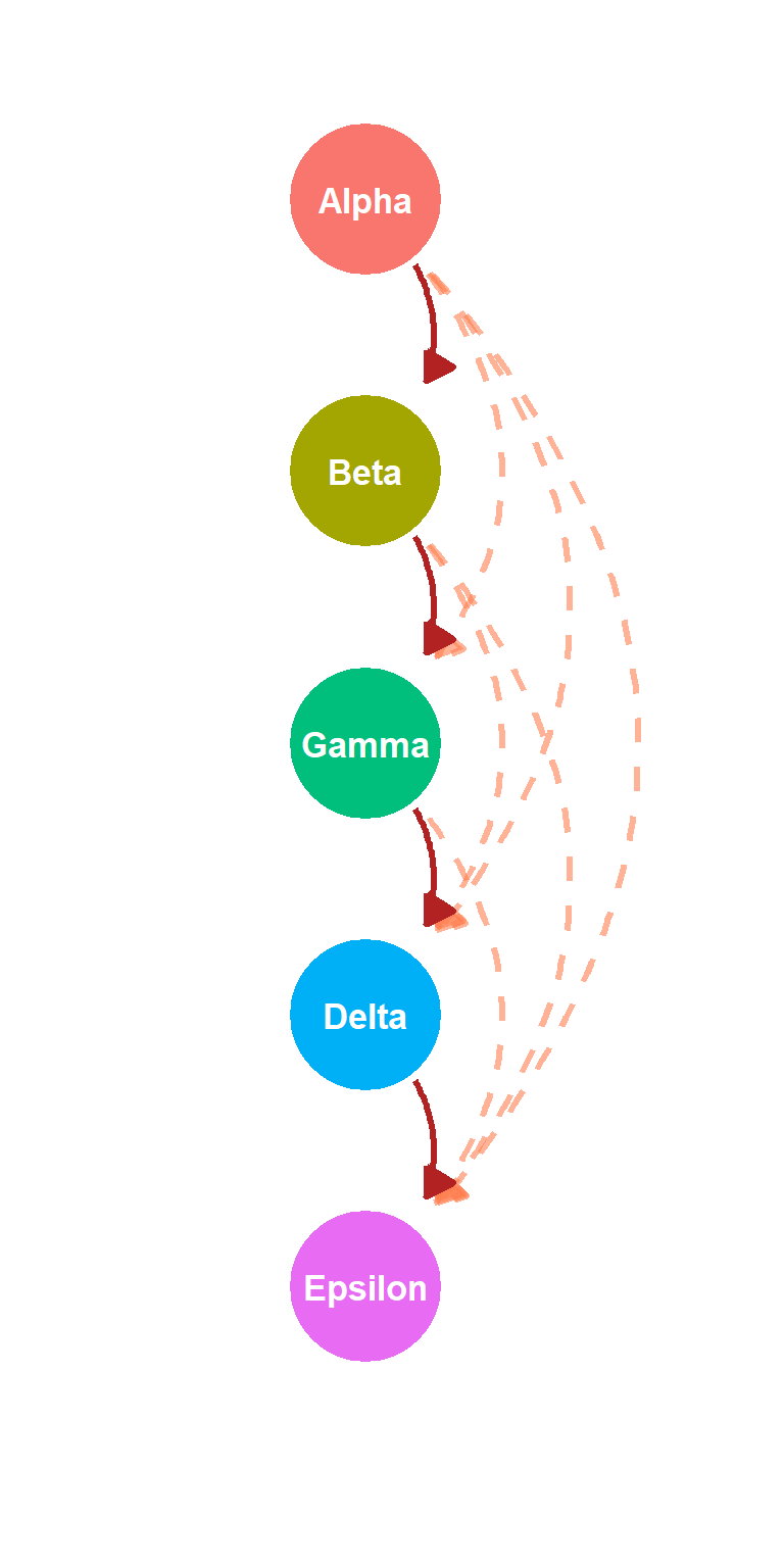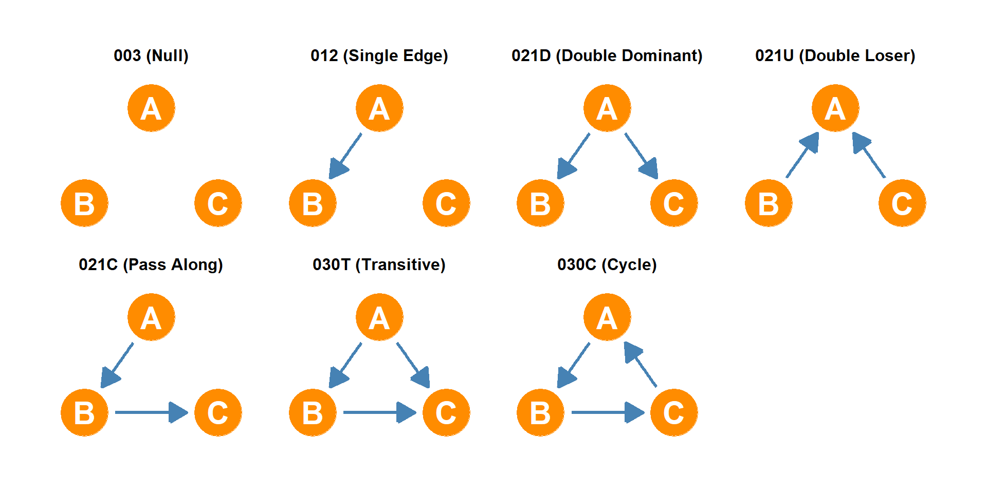 - Pass-along Triad: This configuration involves a chain of dominance, where A dominates B, and B dominates C, but there is no direct link between A and C. While it shows a form of hierarchy, it lacks the direct transitivity that defines a “pure” dominance order, in which A would necessarily dominate C.