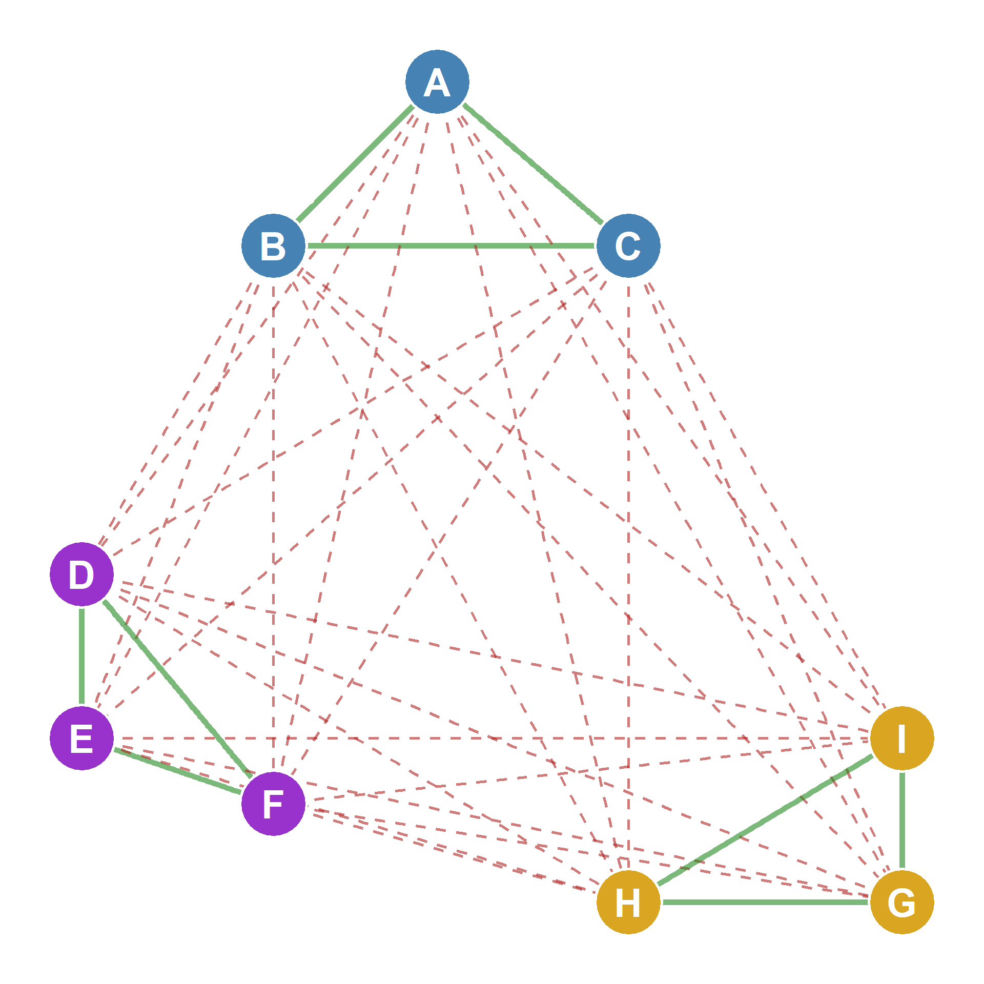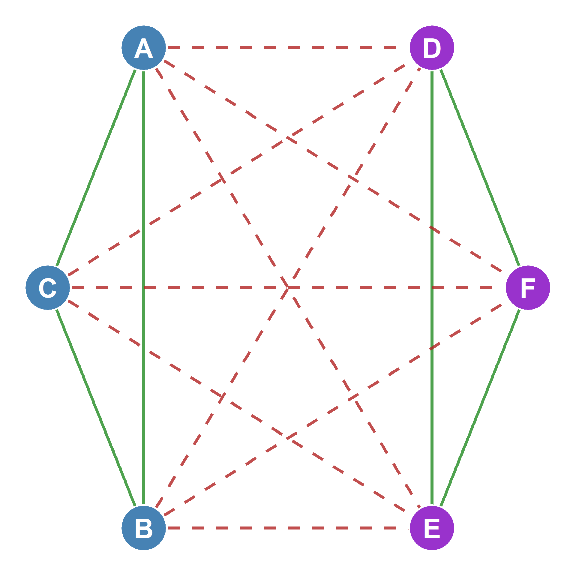 This theorem implies that structural balance is equivalent to perfect group polarization. For example, in a balanced network, nodes A, B, and C (in blue in Figure 40.1) might form one group with positive ties (green solid edges) among themselves, while nodes D, E, and F (in purple in Figure 40.1) form another group with positive ties among themselves, and all ties between these two groups would be negative (in red dashed edges). Note that in Figure 40.1, every triangle is balanced, going by the sign multiplication rule covered in Chapter 39. In a balanced graph, the polarized structure of these two distinct groups can be recovered by rearranging the rows and columns of the signed adjacency matrix such that nodes in the same group are near one another.